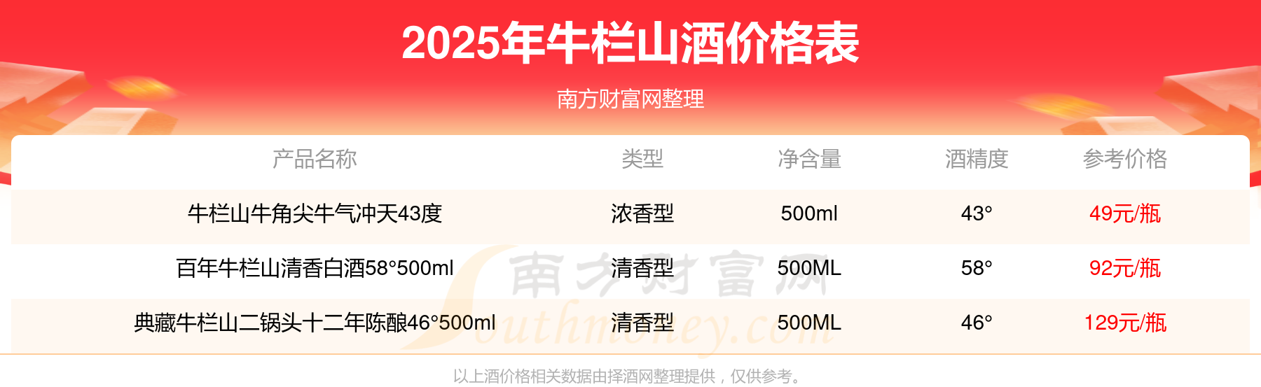 2025年牛欄山酒典藏牛欄山二鍋頭十二年陳釀46°500ml、百年牛欄山清香白酒58°500ml、牛欄山牛角尖牛氣沖天43度等最新價格如下:典藏牛欄山二鍋頭十二年陳釀46°500ml參考價129元/瓶、百年牛欄山清香白酒58°500ml參考價92元/瓶、牛欄山牛角尖牛氣沖天43度參考價49元/瓶。