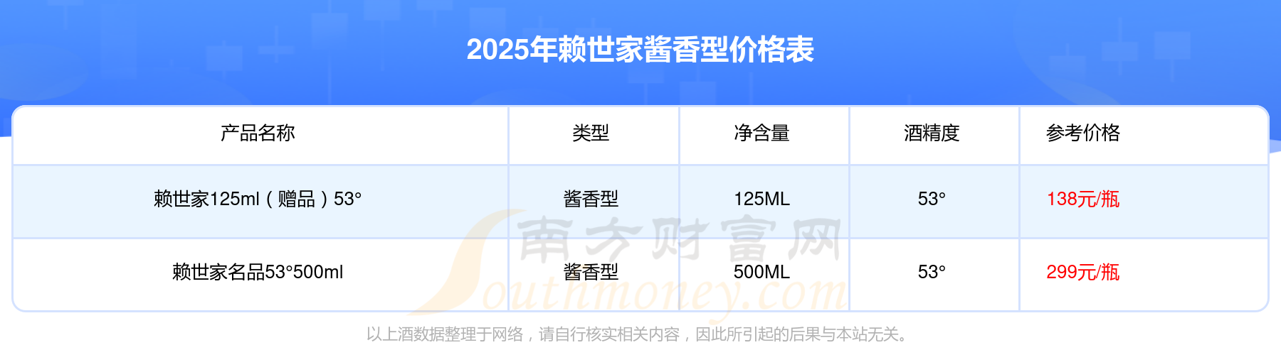 當下賴世家醬香型酒價格最高的酒為賴世家名品53°500ml,參考價299元/瓶,而賴世家醬香型酒價格最低的是賴世家125ml(贈品)53°,參考價138元/瓶,價格高低差為161元/瓶。