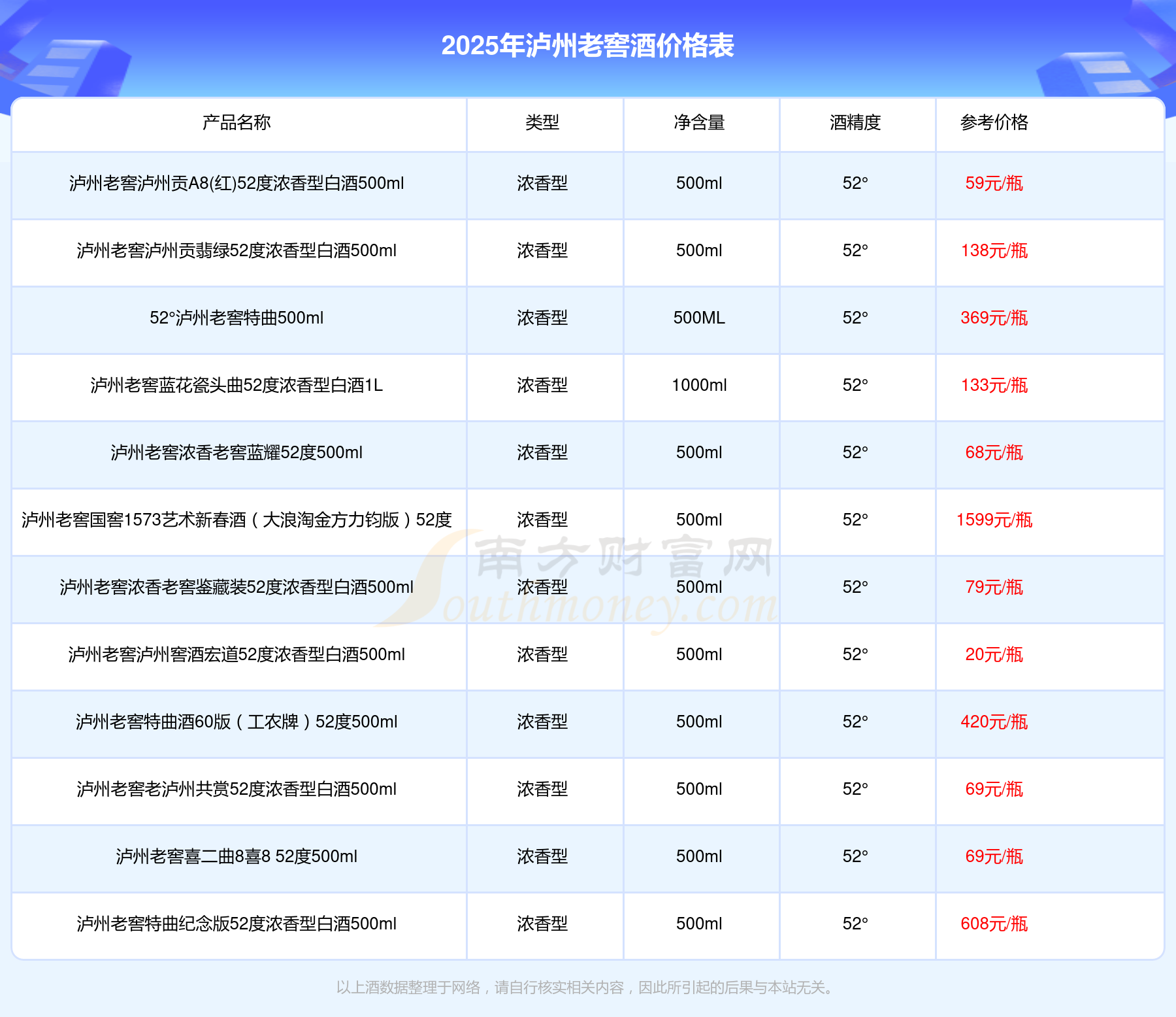 2025年瀘州老窖酒瀘州老窖國窖1573春釀鼠兆豐年E 55度、瀘州老窖國窖1573生命中的那壇酒55度014、瀘州老窖國窖1573春釀鼠兆豐年A 55度等最新價格如下:瀘州老窖國窖1573春釀鼠兆豐年E 55度參考價17999元/瓶、瀘州老窖國窖1573生命中的那壇酒55度014參考價9999元/瓶、瀘州老窖國窖1573春釀鼠兆豐年A 55度參考價5088元/瓶。