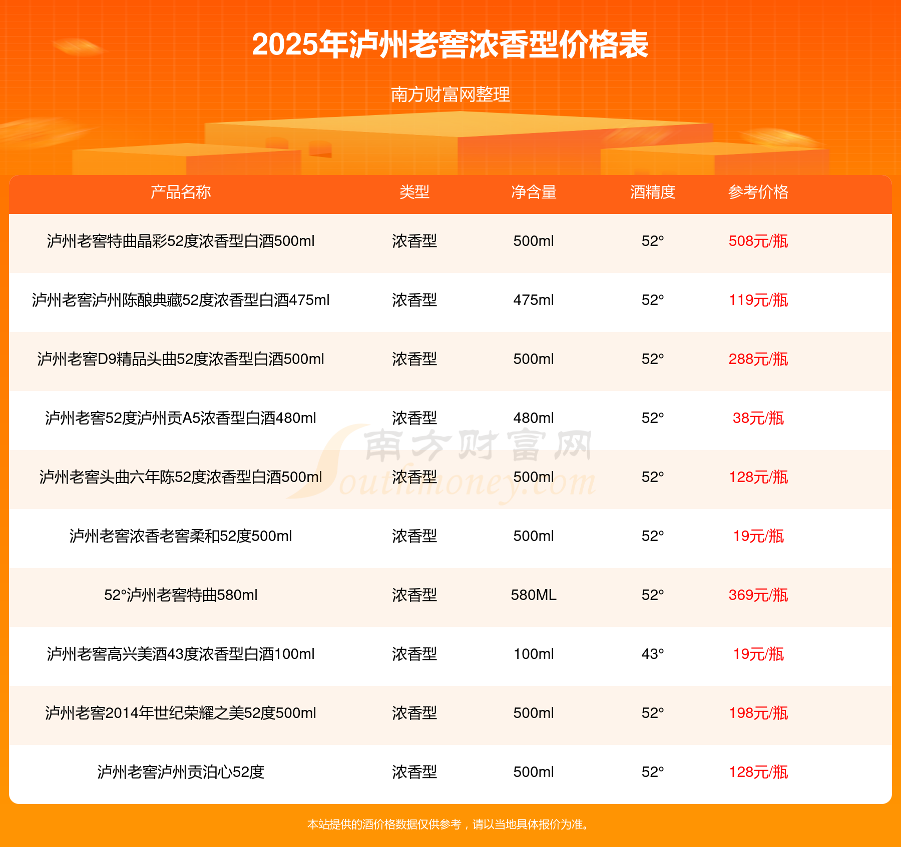 2025年,瀘州老窖國(guó)窖1573春釀鼠兆豐年E 55度、瀘州老窖國(guó)窖1573生命中的那壇酒55度014、瀘州老窖國(guó)窖1573春釀鼠兆豐年A 55度、瀘州老窖國(guó)窖1573生命中的那壇酒55度013濃香型白酒1000ml、瀘州老窖國(guó)窖1573生命中的那壇酒55度009 1000ml、瀘州老窖國(guó)窖1573中國(guó)品味52度濃香型白酒500ml、瀘州老窖國(guó)窖1573許燎源概念作品58度濃香型白酒1000ml、瀘州老窖52度國(guó)窖1573狗年生肖禮盒等瀘州老窖濃香型酒價(jià)格如下:瀘州老窖國(guó)窖1573春釀鼠兆豐年E 55度參考價(jià)17999元/瓶、瀘州老窖國(guó)窖1573生命中的那壇酒55度014參考價(jià)9999元/瓶、瀘州老窖國(guó)窖1573春釀鼠兆豐年A 55度參考價(jià)5088元/瓶、瀘州老窖國(guó)窖1573生命中的那壇酒55度013濃香型白酒1000ml參考價(jià)4988元/瓶、瀘州老窖國(guó)窖1573生命中的那壇酒55度009 1000ml參考價(jià)4288元/瓶、瀘州老窖國(guó)窖1573中國(guó)品味52度濃香型白酒500ml參考價(jià)2888元/瓶、瀘州老窖國(guó)窖1573許燎源概念作品58度濃香型白酒1000ml參考價(jià)2680元/瓶、瀘州老窖52度國(guó)窖1573狗年生肖禮盒參考價(jià)2143元/瓶。