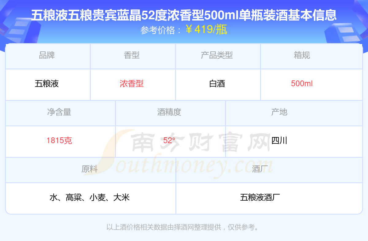 五糧液五糧貴賓藍晶52度濃香型500ml單瓶裝基本信息