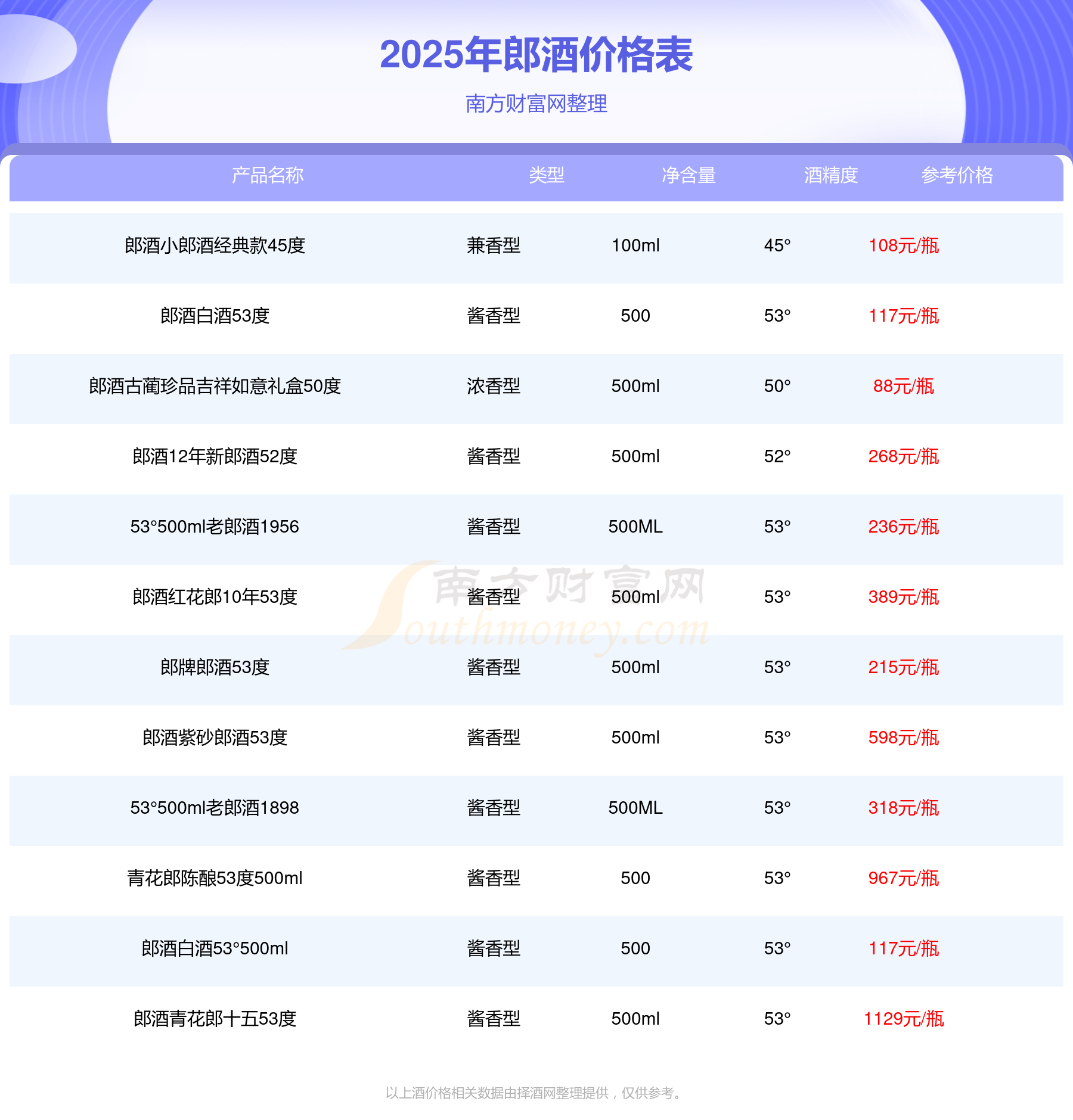 2025年,郎酒青花郎十五53度、青花郎陳釀53度500ml、郎酒紫砂郎酒53度、郎酒紅花郎10年53度、53°500ml老郎酒1898、郎酒12年新郎酒52度、53°500ml老郎酒1956、郎牌郎酒53度等郎酒價格如下:郎酒青花郎十五53度參考價1129元/瓶、青花郎陳釀53度500ml參考價967元/瓶、郎酒紫砂郎酒53度參考價598元/瓶、郎酒紅花郎10年53度參考價389元/瓶、53°500ml老郎酒1898參考價318元/瓶、郎酒12年新郎酒52度參考價268元/瓶、53°500ml老郎酒1956參考價236元/瓶、郎牌郎酒53度參考價215元/瓶。