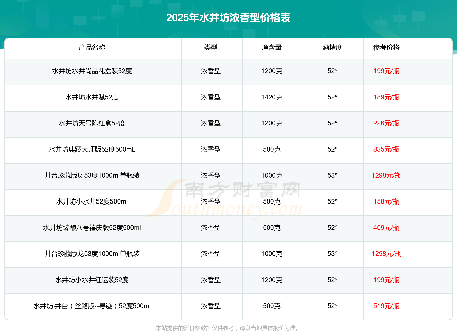 2025年,水井坊大壇收藏級(jí)原漿天球瓶66度、水井坊博物館壹號(hào)53度雙瓶裝、53°水井坊公元十三600ml等水井坊濃香型酒價(jià)格如下:水井坊大壇收藏級(jí)原漿天球瓶66度參考價(jià)13999元/瓶、水井坊博物館壹號(hào)53度雙瓶裝參考價(jià)10988元/瓶、53°水井坊公元十三600ml參考價(jià)2580元/瓶。