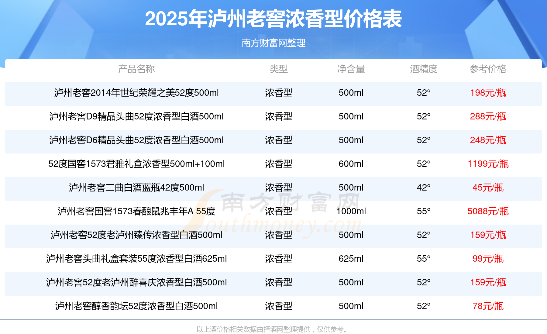 2025年瀘州老窖濃香型酒瀘州老窖國窖1573春釀鼠兆豐年E 55度、瀘州老窖國窖1573生命中的那壇酒55度014、瀘州老窖國窖1573春釀鼠兆豐年A 55度、瀘州老窖國窖1573生命中的那壇酒55度013濃香型白酒1000ml等最新價格如下:瀘州老窖國窖1573春釀鼠兆豐年E 55度參考價17999元/瓶、瀘州老窖國窖1573生命中的那壇酒55度014參考價9999元/瓶、瀘州老窖國窖1573春釀鼠兆豐年A 55度參考價5088元/瓶、瀘州老窖國窖1573生命中的那壇酒55度013濃香型白酒1000ml參考價4988元/瓶。