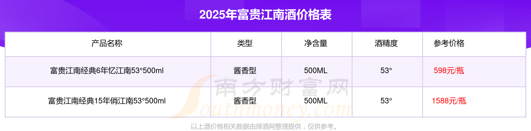2025年,富貴江南經(jīng)典15年俏江南53°500ml、富貴江南經(jīng)典6年憶江南53°500ml等富貴江南酒價(jià)格如下:富貴江南經(jīng)典15年俏江南53°500ml參考價(jià)1588元/瓶、富貴江南經(jīng)典6年憶江南53°500ml參考價(jià)598元/瓶。