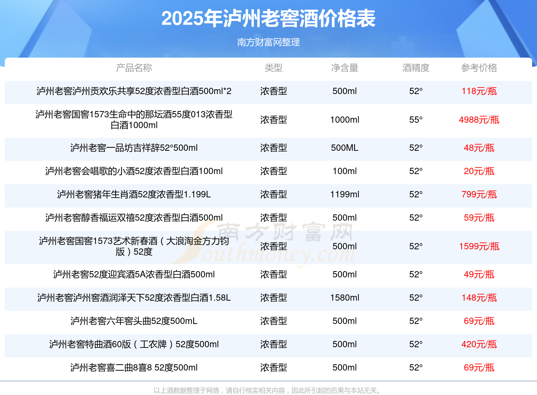 瀘州老窖國(guó)窖1573春釀鼠兆豐年E 55度參考價(jià)17999元/瓶、瀘州老窖國(guó)窖1573生命中的那壇酒55度014參考價(jià)9999元/瓶、瀘州老窖國(guó)窖1573春釀鼠兆豐年A 55度參考價(jià)5088元/瓶、瀘州老窖國(guó)窖1573生命中的那壇酒55度013濃香型白酒1000ml參考價(jià)4988元/瓶、瀘州老窖國(guó)窖1573生命中的那壇酒55度009 1000ml參考價(jià)4288元/瓶。