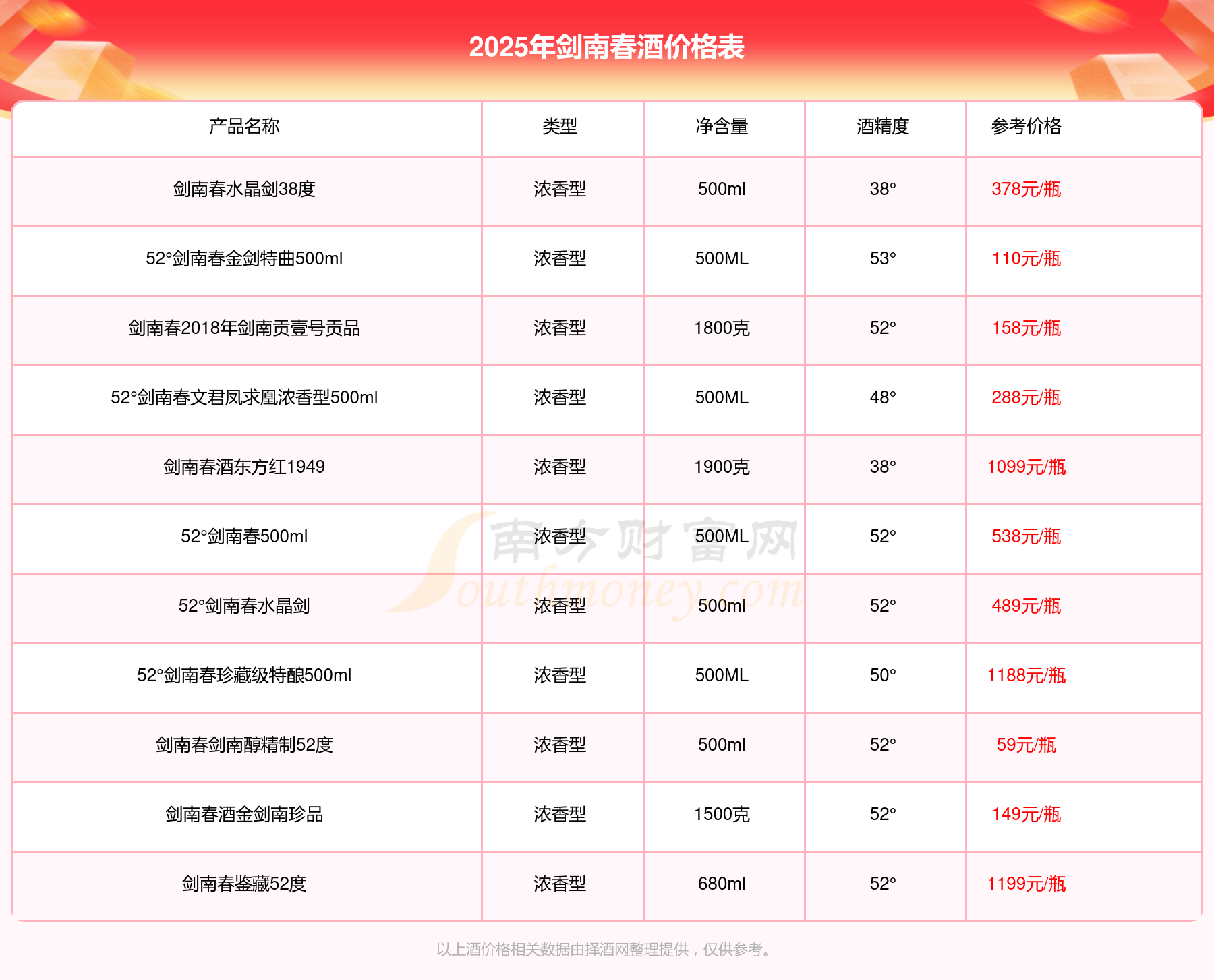 2025年劍南春酒劍南春鑒藏52度、52°劍南春珍藏級特釀500ml、劍南春酒東方紅1949、52°劍南春500ml、52°劍南春水晶劍、劍南春水晶劍38度等最新價格如下:劍南春鑒藏52度參考價1199元/瓶、52°劍南春珍藏級特釀500ml參考價1188元/瓶、劍南春酒東方紅1949參考價1099元/瓶、52°劍南春500ml參考價538元/瓶、52°劍南春水晶劍參考價489元/瓶、劍南春水晶劍38度參考價378元/瓶。