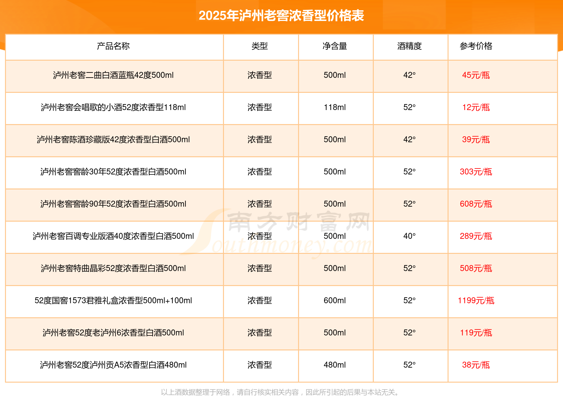 2025年,瀘州老窖國(guó)窖1573春釀鼠兆豐年E 55度、瀘州老窖國(guó)窖1573生命中的那壇酒55度014、瀘州老窖國(guó)窖1573春釀鼠兆豐年A 55度、瀘州老窖國(guó)窖1573生命中的那壇酒55度013濃香型白酒1000ml、瀘州老窖國(guó)窖1573生命中的那壇酒55度009 1000ml等瀘州老窖濃香型酒價(jià)格如下:瀘州老窖國(guó)窖1573春釀鼠兆豐年E 55度參考價(jià)17999元/瓶、瀘州老窖國(guó)窖1573生命中的那壇酒55度014參考價(jià)9999元/瓶、瀘州老窖國(guó)窖1573春釀鼠兆豐年A 55度參考價(jià)5088元/瓶、瀘州老窖國(guó)窖1573生命中的那壇酒55度013濃香型白酒1000ml參考價(jià)4988元/瓶、瀘州老窖國(guó)窖1573生命中的那壇酒55度009 1000ml參考價(jià)4288元/瓶。
