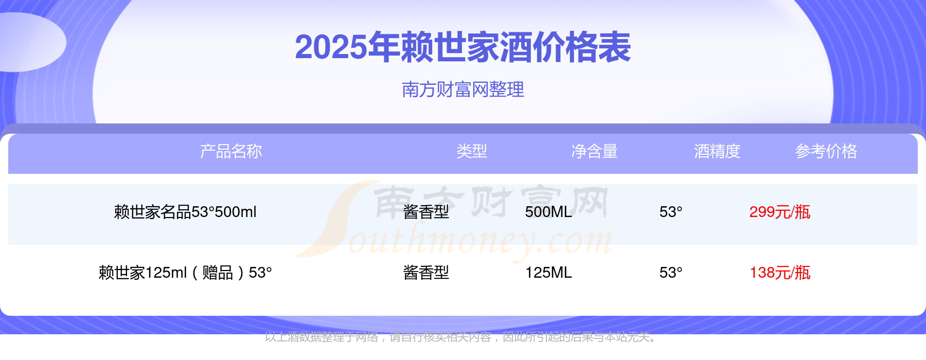 賴世家酒最新價(jià)格2025:賴世家名品53°500ml參考價(jià)299元/瓶、賴世家125ml(贈(zèng)品)53°參考價(jià)138元/瓶。