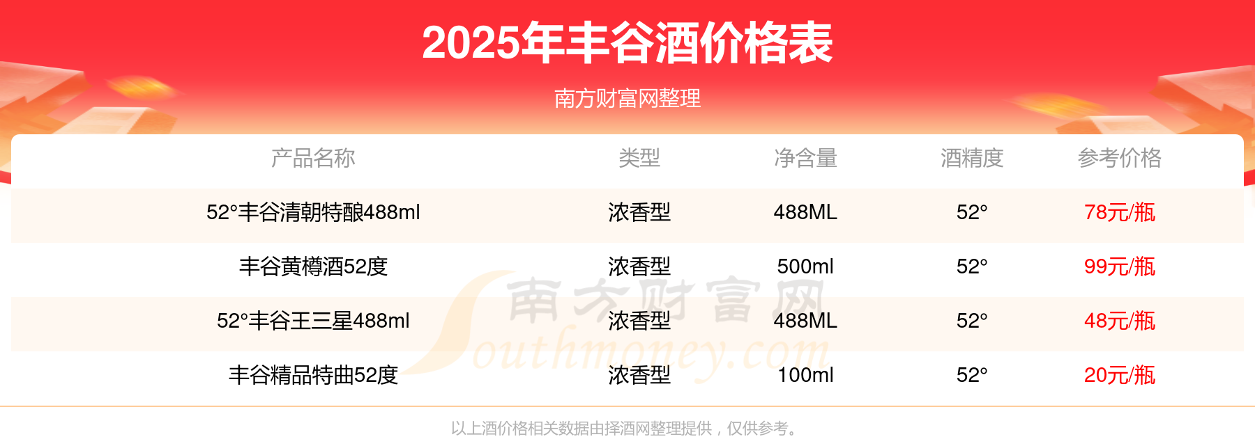 豐谷黃樽酒52度參考價99元/瓶、52°豐谷清朝特釀488ml參考價78元/瓶、52°豐谷王三星488ml參考價48元/瓶、豐谷精品特曲52度參考價20元/瓶。