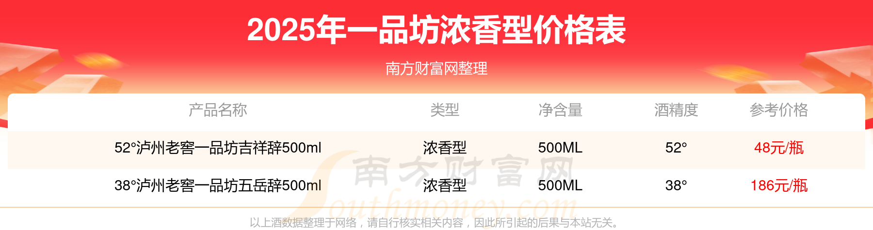 2025一品坊濃香型酒最新價(jià)格:38°瀘州老窖一品坊五岳辭500ml參考價(jià)186元/瓶、52°瀘州老窖一品坊吉祥辭500ml參考價(jià)48元/瓶。