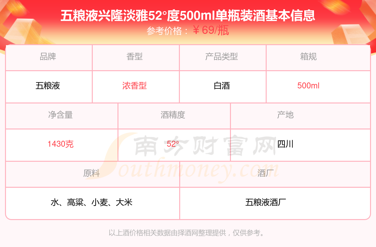 五糧液興隆淡雅52°度500ml單瓶裝基本信息