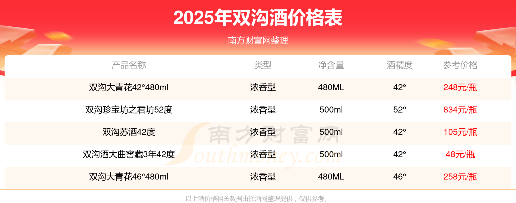 雙溝珍寶坊之君坊52度參考價(jià)834元/瓶、雙溝大青花46°480ml參考價(jià)258元/瓶、雙溝大青花42°480ml參考價(jià)248元/瓶、雙溝蘇酒42度參考價(jià)105元/瓶。