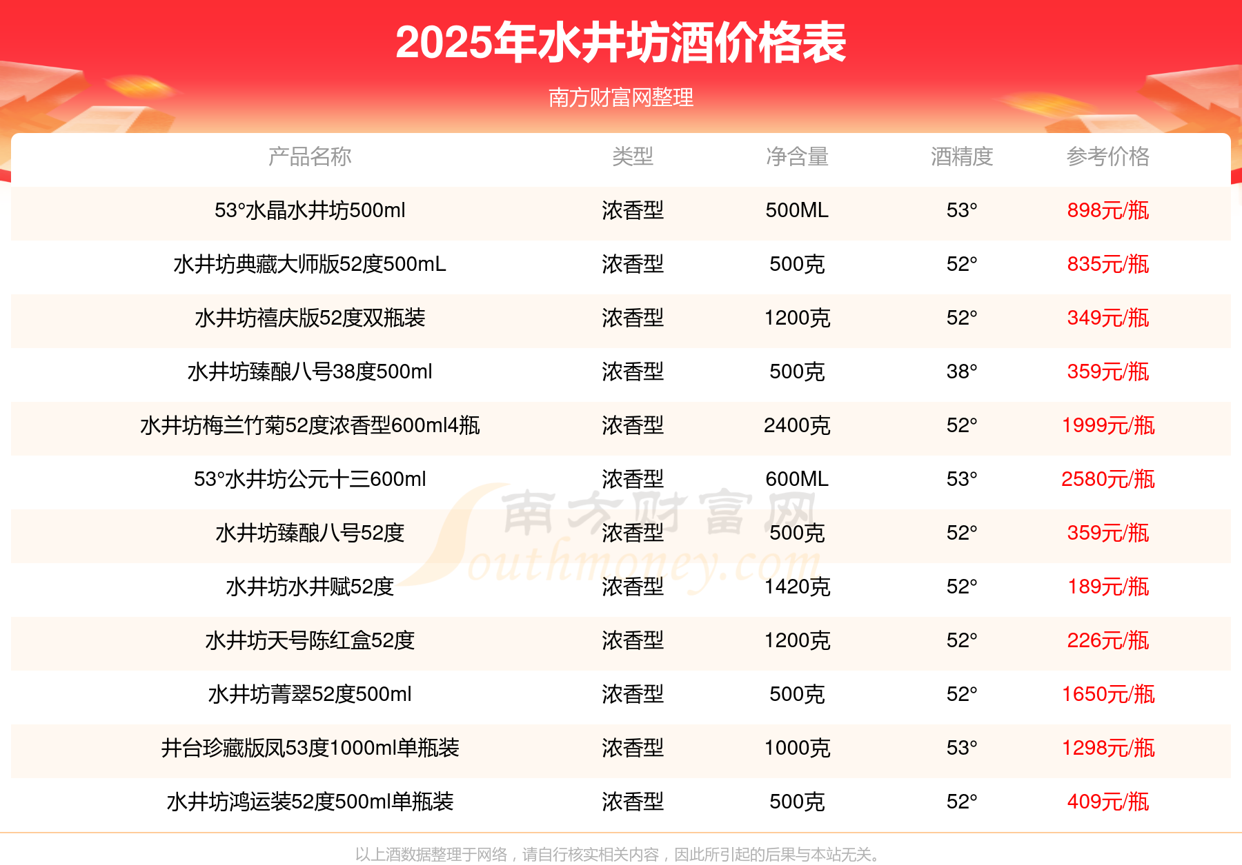 2025年水井坊酒水井坊大壇收藏級原漿天球瓶66度、水井坊博物館壹號53度雙瓶裝、53°水井坊公元十三600ml、水井坊梅蘭竹菊52度濃香型600ml4瓶、水井坊菁翠52度500ml等最新價(jià)格如下: