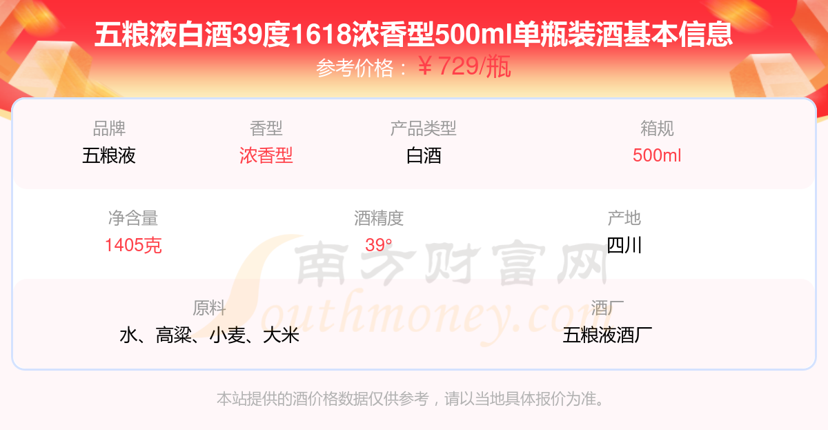 五糧液白酒39度1618濃香型500ml單瓶裝基本信息