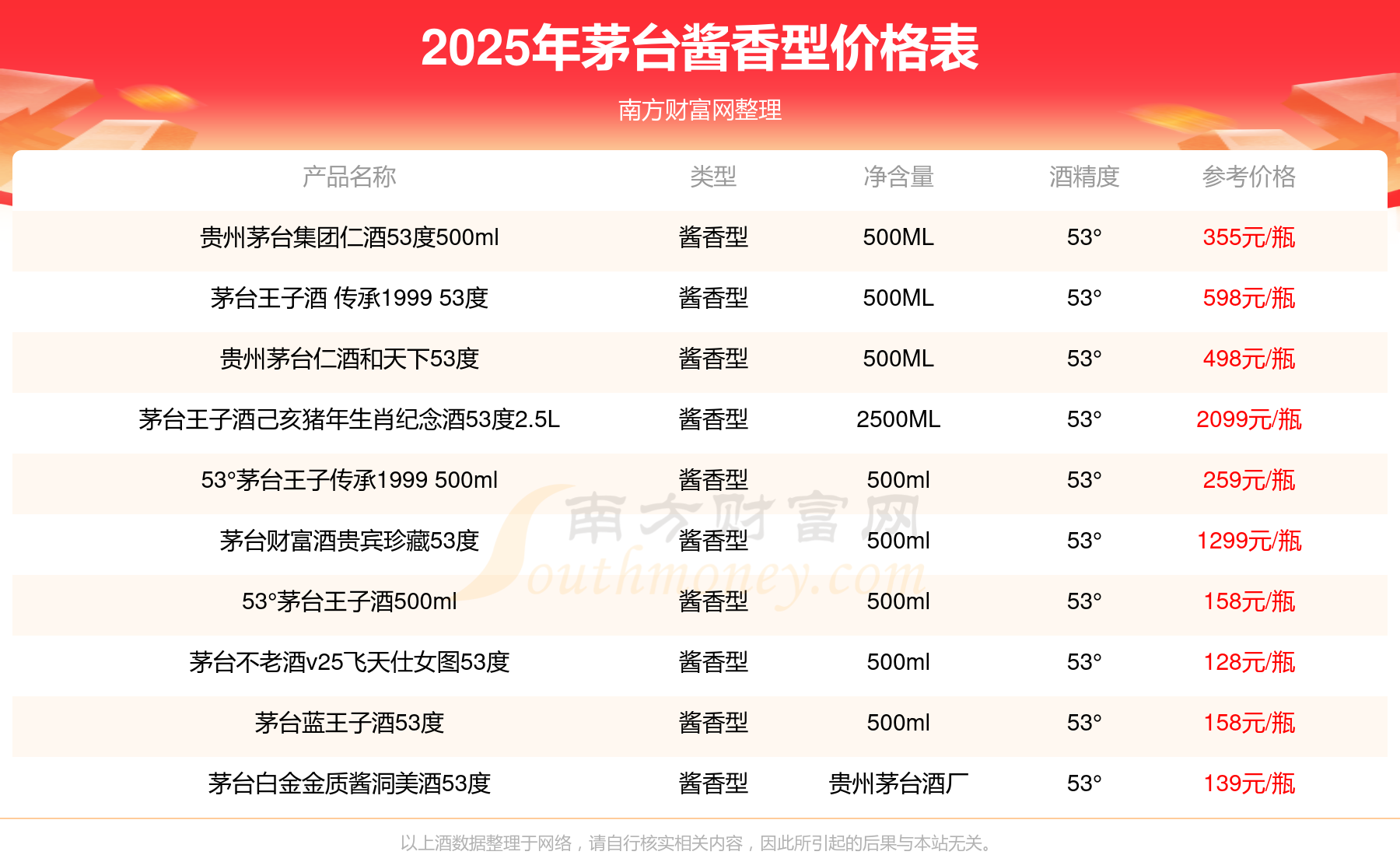 華茅鑒藏 醬香型白酒 3L 53°參考價8388元/瓶、53度五星茅臺生肖酒丁酉雞年參考價2798元/瓶、貴州茅臺己亥豬年生肖酒53°500ml參考價2699元/瓶、53度五星茅臺生肖酒戊戌狗年參考價2698元/瓶。