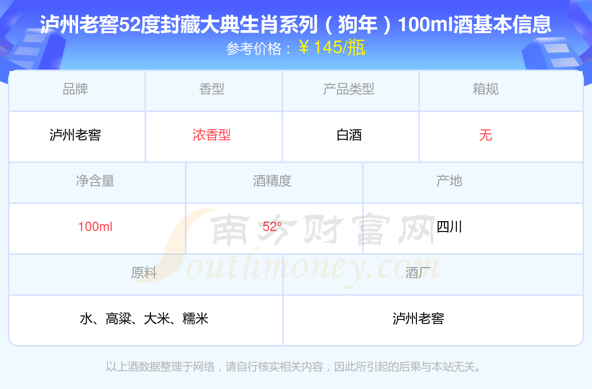 瀘州老窖52度封藏大典生肖系列(狗年)100ml基本信息