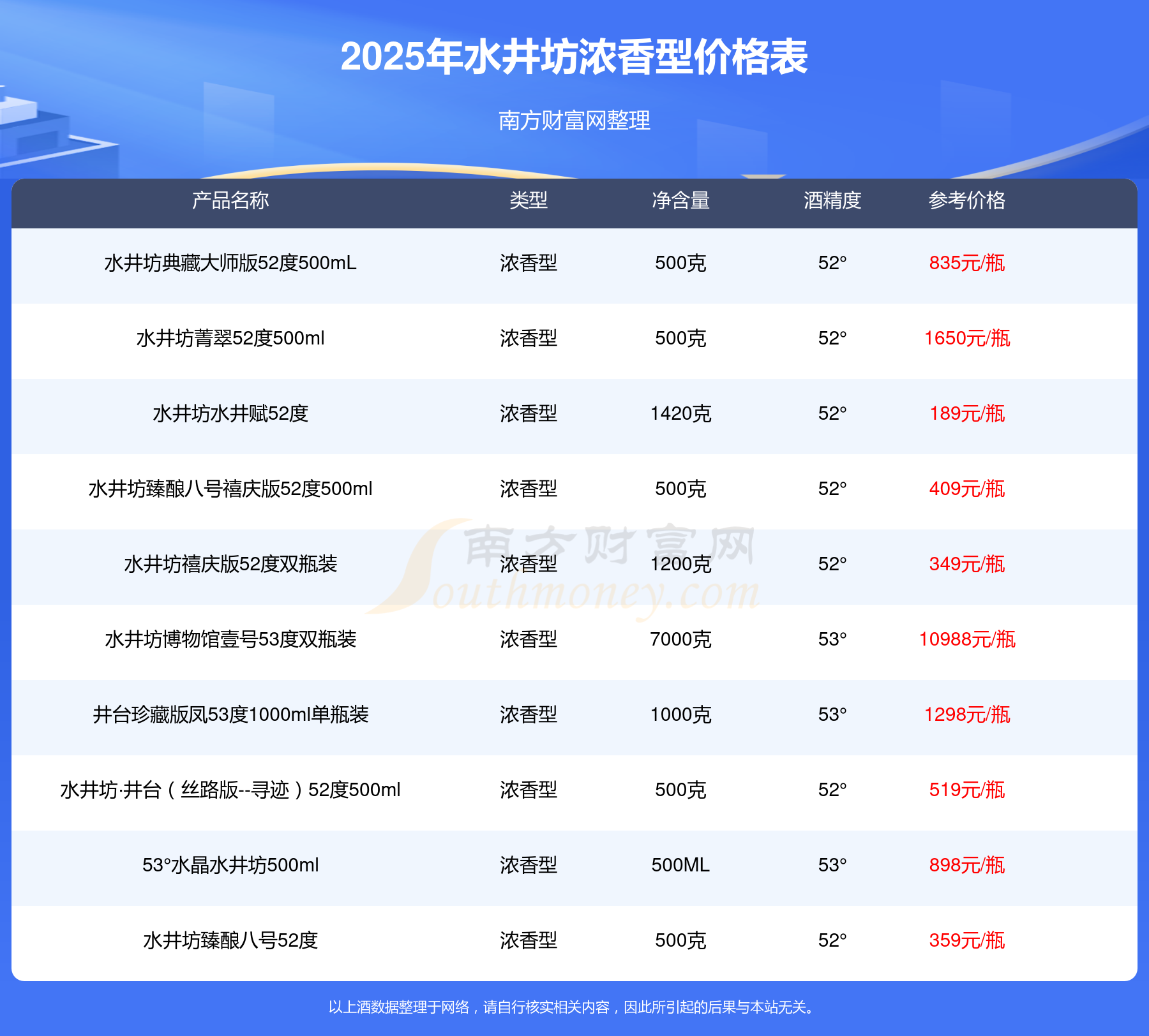 水井坊濃香型酒最新價(jià)格2025:水井坊大壇收藏級原漿天球瓶66度參考價(jià)13999元/瓶、水井坊博物館壹號53度雙瓶裝參考價(jià)10988元/瓶、53°水井坊公元十三600ml參考價(jià)2580元/瓶。