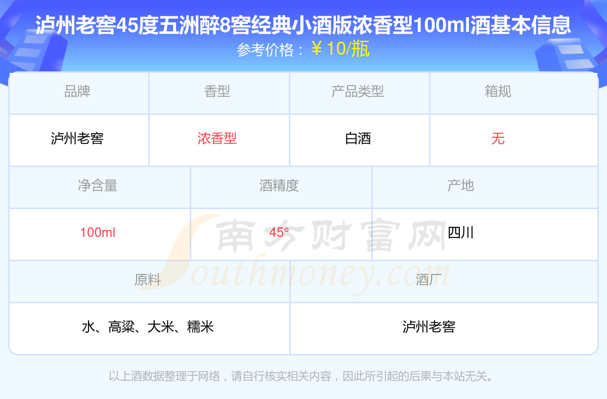 瀘州老窖45度五洲醉8窖經(jīng)典小酒版濃香型100ml基本信息