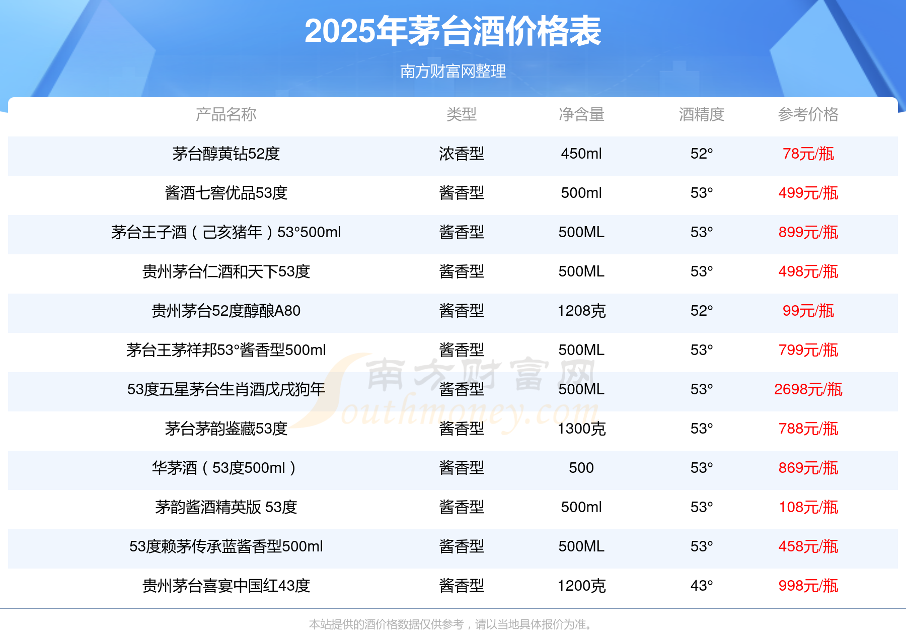茅臺(tái)酒最新價(jià)格2025:華茅鑒藏 醬香型白酒 3L 53°參考價(jià)8388元/瓶、53度五星茅臺(tái)生肖酒丁酉雞年參考價(jià)2798元/瓶、貴州茅臺(tái)己亥豬年生肖酒53°500ml參考價(jià)2699元/瓶、53度五星茅臺(tái)生肖酒戊戌狗年參考價(jià)2698元/瓶、飛天茅臺(tái)53°500ml(2015年)參考價(jià)2199元/瓶、茅臺(tái)王子酒己亥豬年生肖紀(jì)念酒53度2.5L參考價(jià)2099元/瓶、茅臺(tái)1935醬香型53度參考價(jià)1799元/瓶。