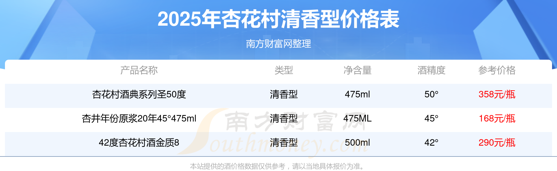 杏花村清香型酒最新價格2025:杏花村酒典系列圣50度參考價358元/瓶、42度杏花村酒金質(zhì)8參考價290元/瓶、杏井年份原漿20年45°475ml參考價168元/瓶。