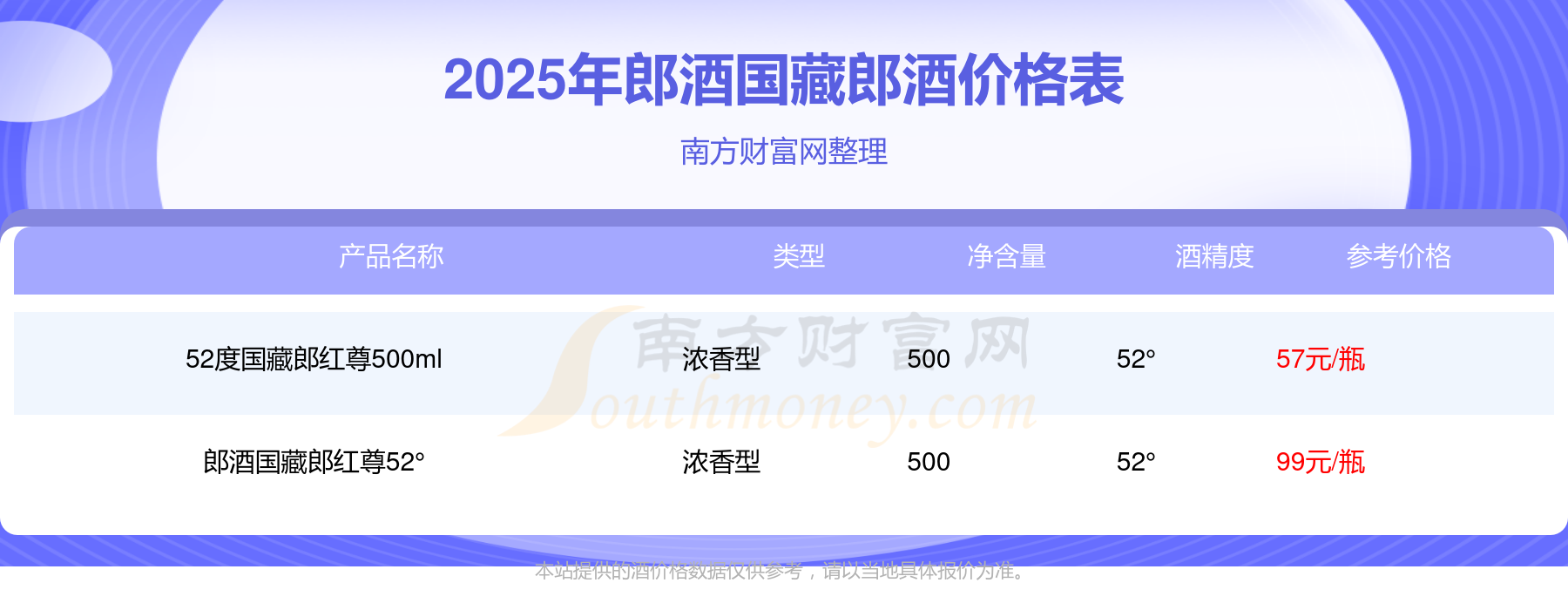郎酒國藏郎酒最新價格2025:郎酒國藏郎紅尊52°參考價99元/瓶、52度國藏郎紅尊500ml參考價57元/瓶。