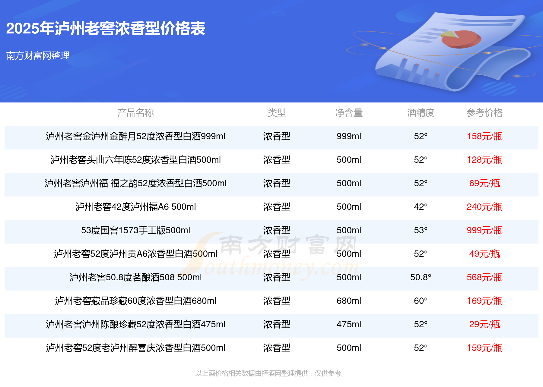 2025年,瀘州老窖國(guó)窖1573春釀鼠兆豐年E 55度、瀘州老窖國(guó)窖1573生命中的那壇酒55度014、瀘州老窖國(guó)窖1573春釀鼠兆豐年A 55度、瀘州老窖國(guó)窖1573生命中的那壇酒55度013濃香型白酒1000ml、瀘州老窖國(guó)窖1573生命中的那壇酒55度009 1000ml、瀘州老窖國(guó)窖1573中國(guó)品味52度濃香型白酒500ml、瀘州老窖國(guó)窖1573許燎源概念作品58度濃香型白酒1000ml等瀘州老窖濃香型酒參考價(jià)格如下:瀘州老窖國(guó)窖1573春釀鼠兆豐年E 55度參考價(jià)17999元、瀘州老窖國(guó)窖1573生命中的那壇酒55度014參考價(jià)9999元、瀘州老窖國(guó)窖1573春釀鼠兆豐年A 55度參考價(jià)5088元、瀘州老窖國(guó)窖1573生命中的那壇酒55度013濃香型白酒1000ml參考價(jià)4988元、瀘州老窖國(guó)窖1573生命中的那壇酒55度009 1000ml參考價(jià)4288元、瀘州老窖國(guó)窖1573中國(guó)品味52度濃香型白酒500ml參考價(jià)2888元、瀘州老窖國(guó)窖1573許燎源概念作品58度濃香型白酒1000ml參考價(jià)2680元。