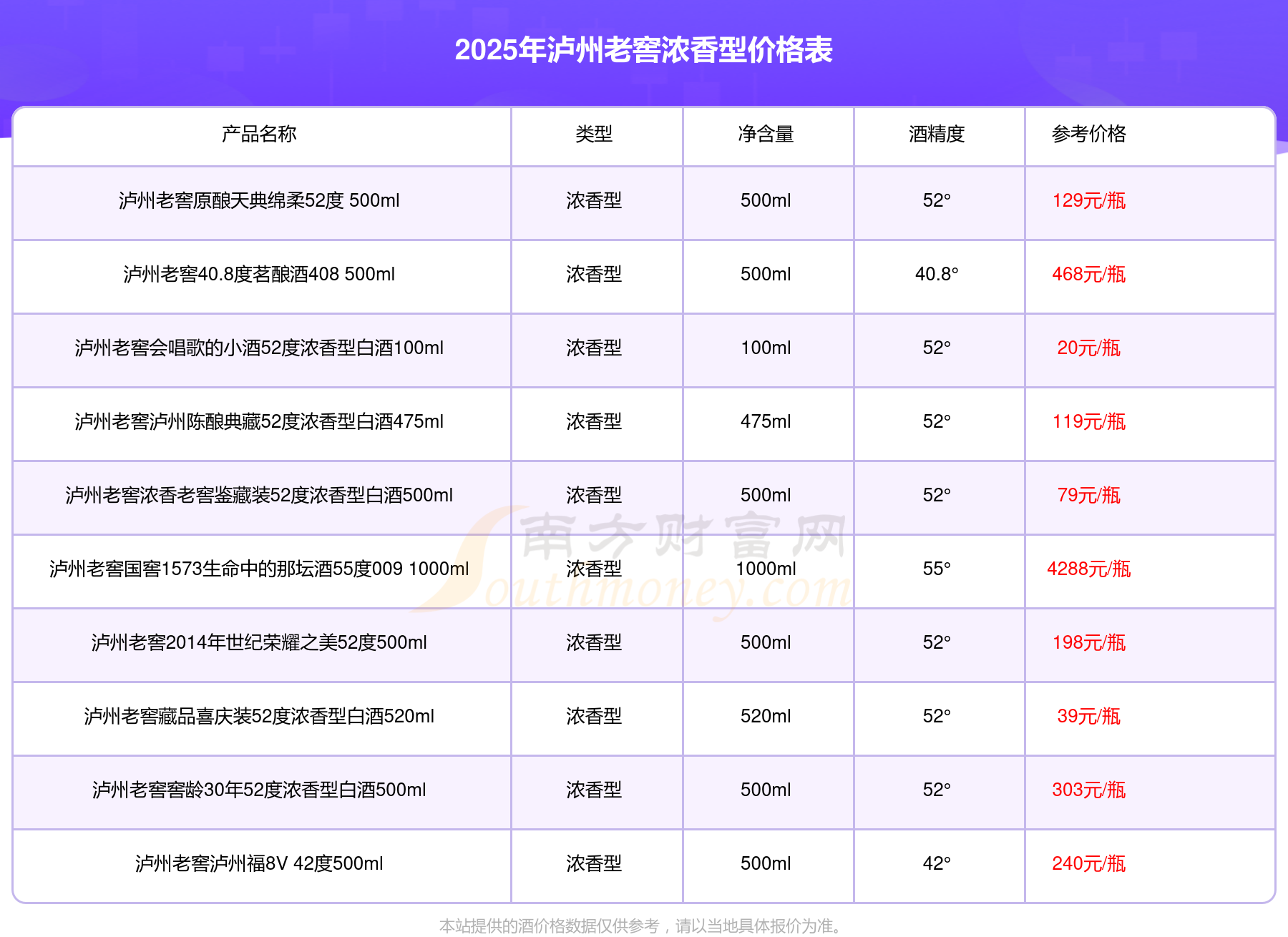 2025年瀘州老窖濃香型酒瀘州老窖國(guó)窖1573春釀鼠兆豐年E 55度、瀘州老窖國(guó)窖1573生命中的那壇酒55度014、瀘州老窖國(guó)窖1573春釀鼠兆豐年A 55度、瀘州老窖國(guó)窖1573生命中的那壇酒55度013濃香型白酒1000ml、瀘州老窖國(guó)窖1573生命中的那壇酒55度009 1000ml、瀘州老窖國(guó)窖1573中國(guó)品味52度濃香型白酒500ml等最新價(jià)格如下:瀘州老窖國(guó)窖1573春釀鼠兆豐年E 55度參考價(jià)17999元/瓶、瀘州老窖國(guó)窖1573生命中的那壇酒55度014參考價(jià)9999元/瓶、瀘州老窖國(guó)窖1573春釀鼠兆豐年A 55度參考價(jià)5088元/瓶、瀘州老窖國(guó)窖1573生命中的那壇酒55度013濃香型白酒1000ml參考價(jià)4988元/瓶、瀘州老窖國(guó)窖1573生命中的那壇酒55度009 1000ml參考價(jià)4288元/瓶、瀘州老窖國(guó)窖1573中國(guó)品味52度濃香型白酒500ml參考價(jià)2888元/瓶。