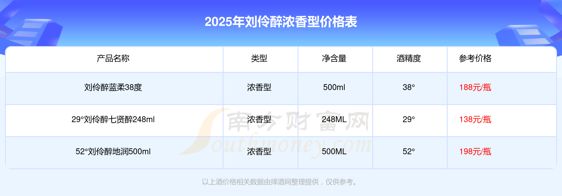 2025年劉伶醉濃香型酒52°劉伶醉地潤500ml、劉伶醉藍柔38度、29°劉伶醉七賢醉248ml等最新價格如下: