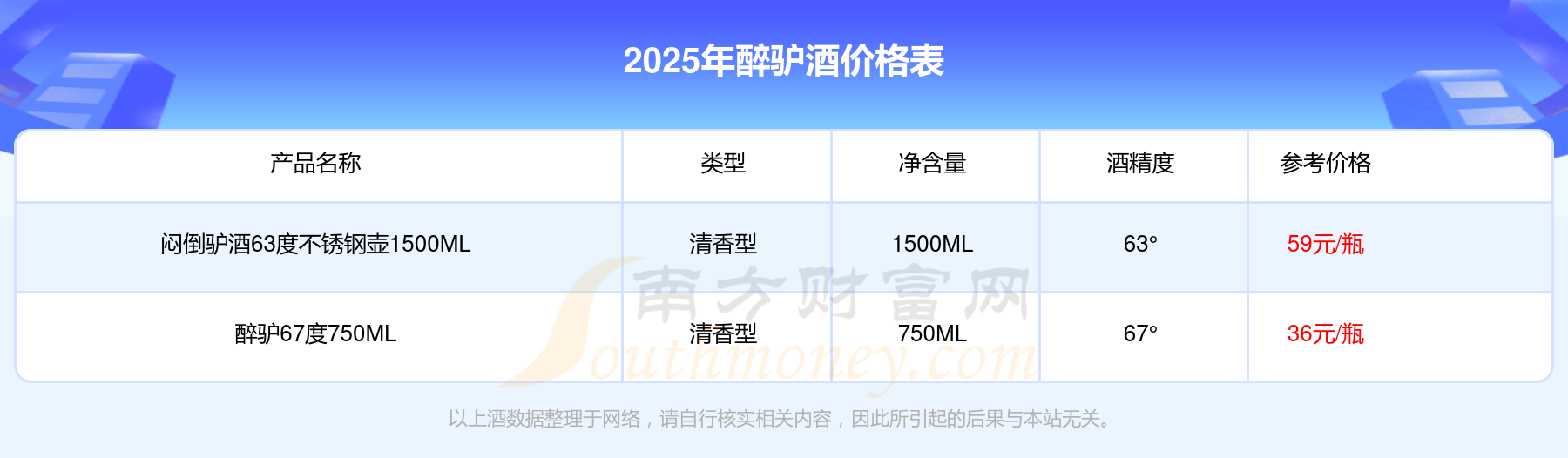 悶倒驢酒63度不銹鋼壺1500ML參考價59元/瓶、醉驢67度750ML參考價36元/瓶。