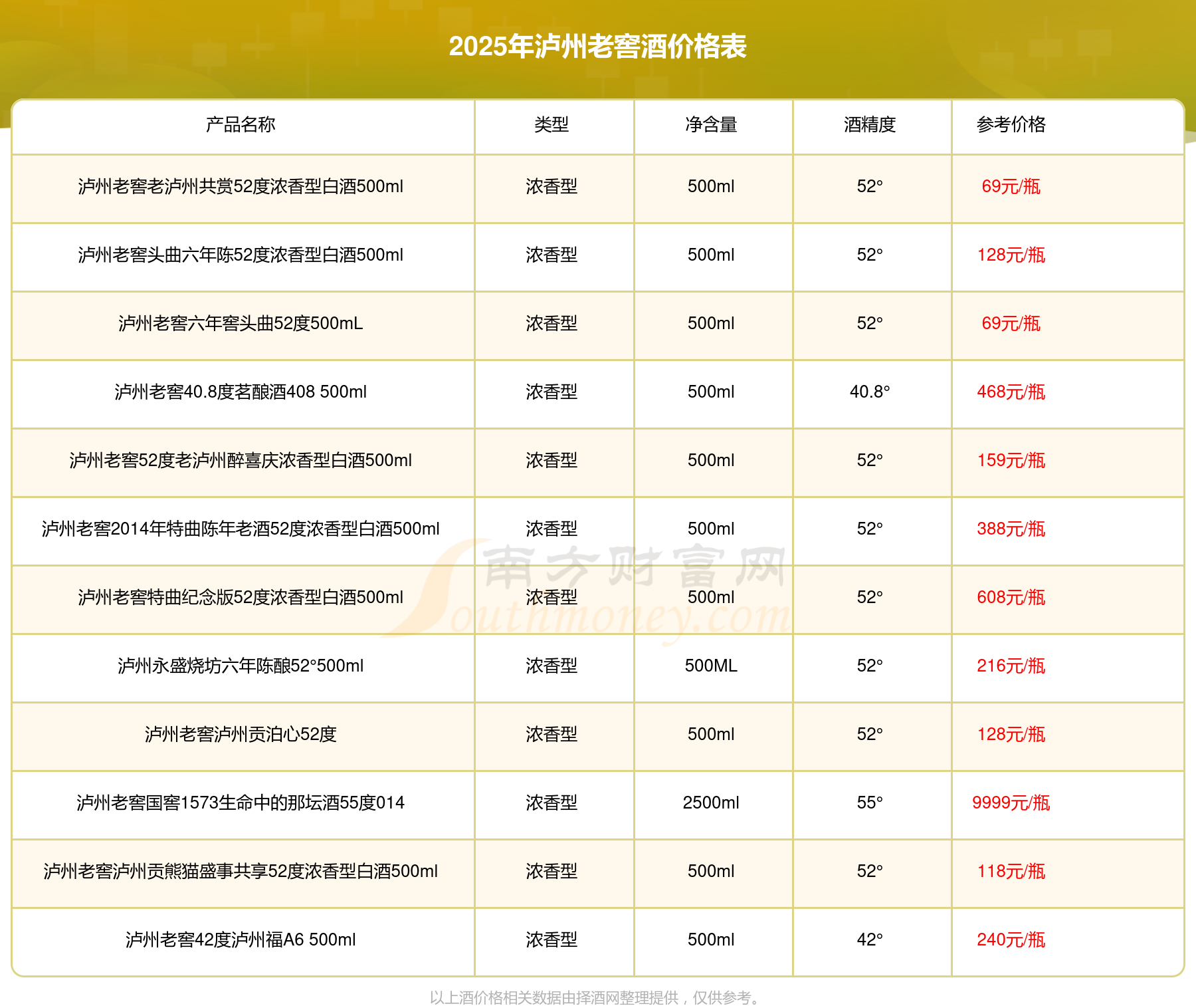 瀘州老窖酒最新價格2025:瀘州老窖國窖1573春釀鼠兆豐年E 55度參考價17999元/瓶、瀘州老窖國窖1573生命中的那壇酒55度014參考價9999元/瓶、瀘州老窖國窖1573春釀鼠兆豐年A 55度參考價5088元/瓶、瀘州老窖國窖1573生命中的那壇酒55度013濃香型白酒1000ml參考價4988元/瓶。