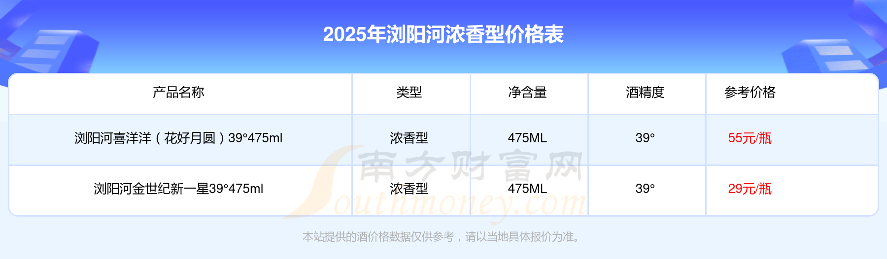 2025年,瀏陽河喜洋洋(花好月圓)39°475ml、瀏陽河金世紀新一星39°475ml等瀏陽河濃香型酒價格如下: