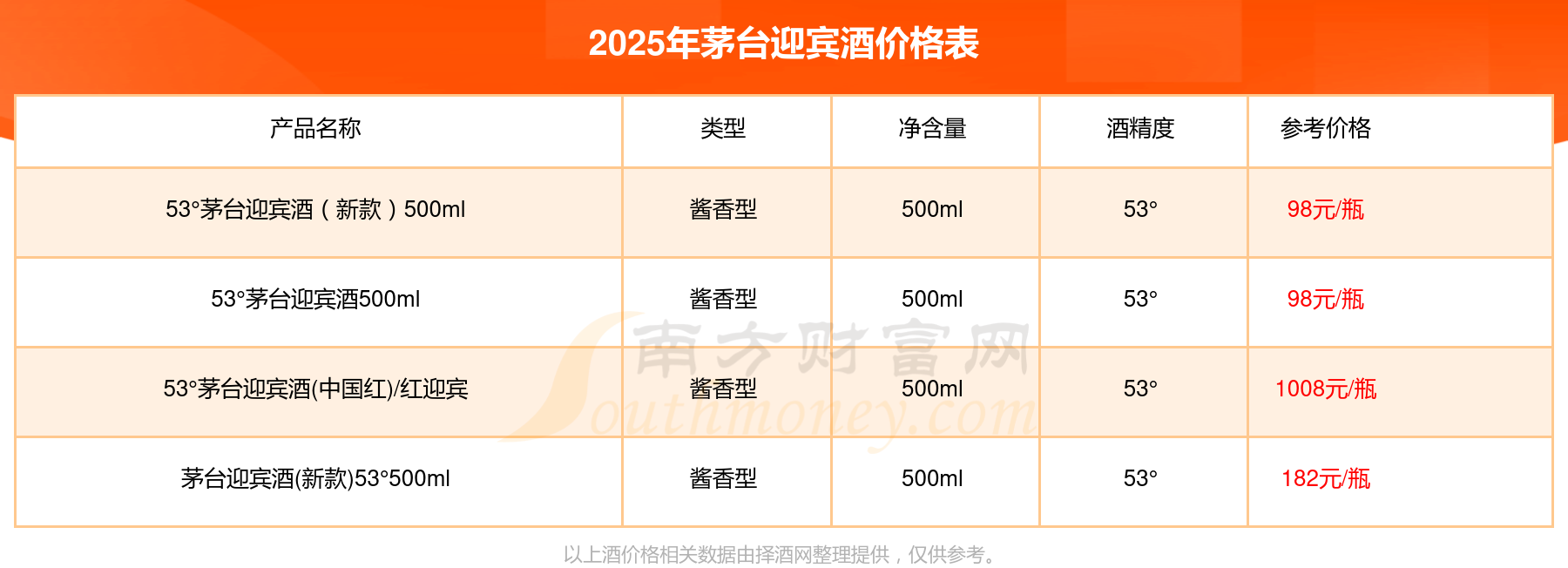 2025年,53°茅臺迎賓酒(中國紅)/紅迎賓、茅臺迎賓酒(新款)53°500ml、53°茅臺迎賓酒(新款)500ml、53°茅臺迎賓酒500ml等茅臺迎賓酒價(jià)格如下:53°茅臺迎賓酒(中國紅)/紅迎賓參考價(jià)1008元/瓶、茅臺迎賓酒(新款)53°500ml參考價(jià)182元/瓶、53°茅臺迎賓酒(新款)500ml參考價(jià)98元/瓶、53°茅臺迎賓酒500ml參考價(jià)98元/瓶。