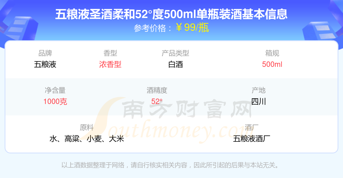 五糧液圣酒柔和52°度500ml單瓶裝基本信息