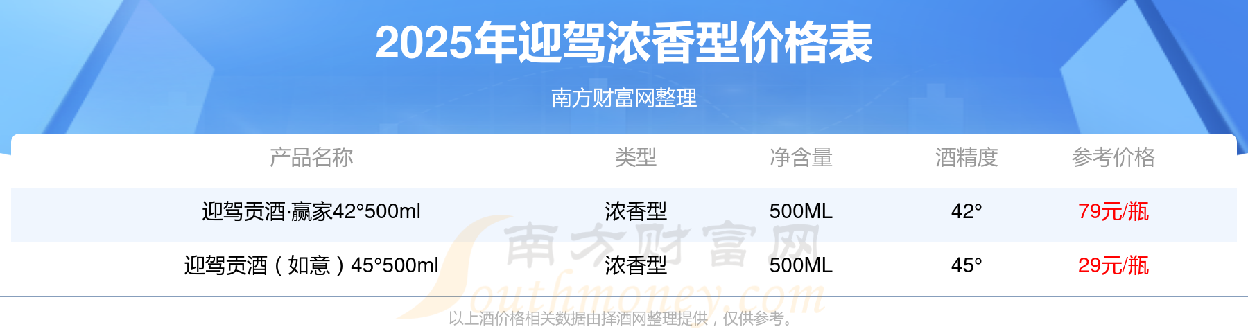 2025年,迎駕貢酒·贏家42°500ml、迎駕貢酒(如意)45°500ml等迎駕濃香型酒價格如下:迎駕貢酒·贏家42°500ml參考價79元/瓶、迎駕貢酒(如意)45°500ml參考價29元/瓶。