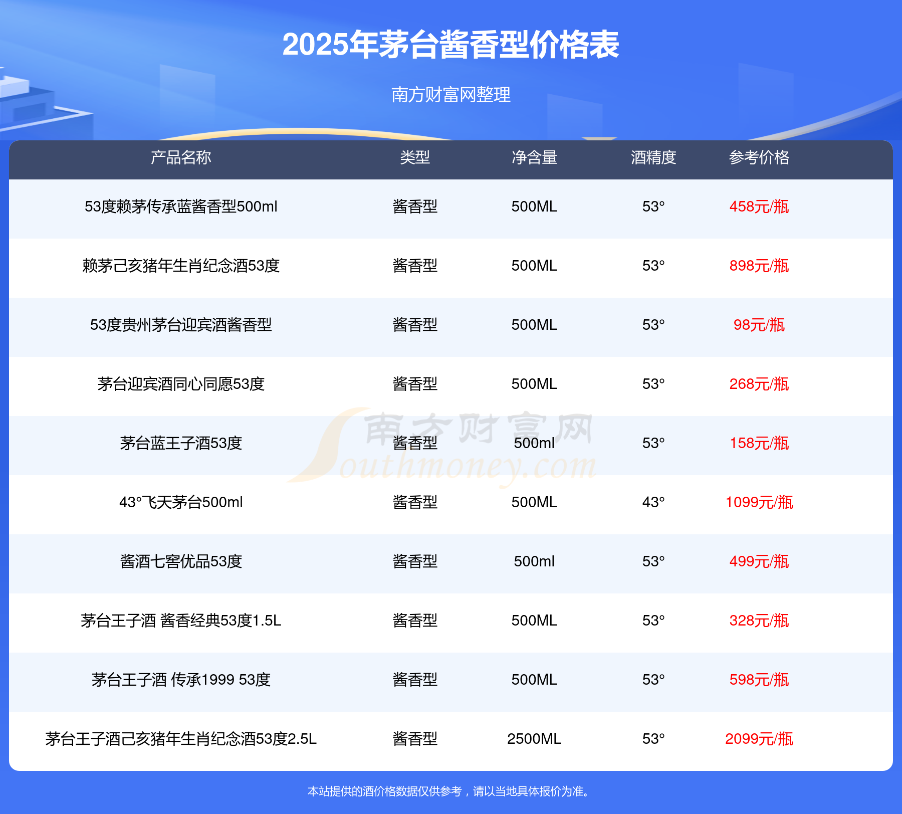 華茅鑒藏 醬香型白酒 3L 53°參考價8388元/瓶、53度五星茅臺生肖酒丁酉雞年參考價2798元/瓶、貴州茅臺己亥豬年生肖酒53°500ml參考價2699元/瓶、53度五星茅臺生肖酒戊戌狗年參考價2698元/瓶、飛天茅臺53°500ml(2015年)參考價2199元/瓶、茅臺王子酒己亥豬年生肖紀念酒53度2.5L參考價2099元/瓶、茅臺1935醬香型53度參考價1799元/瓶、茅臺財富貴賓典藏酒53度參考價1599元/瓶。