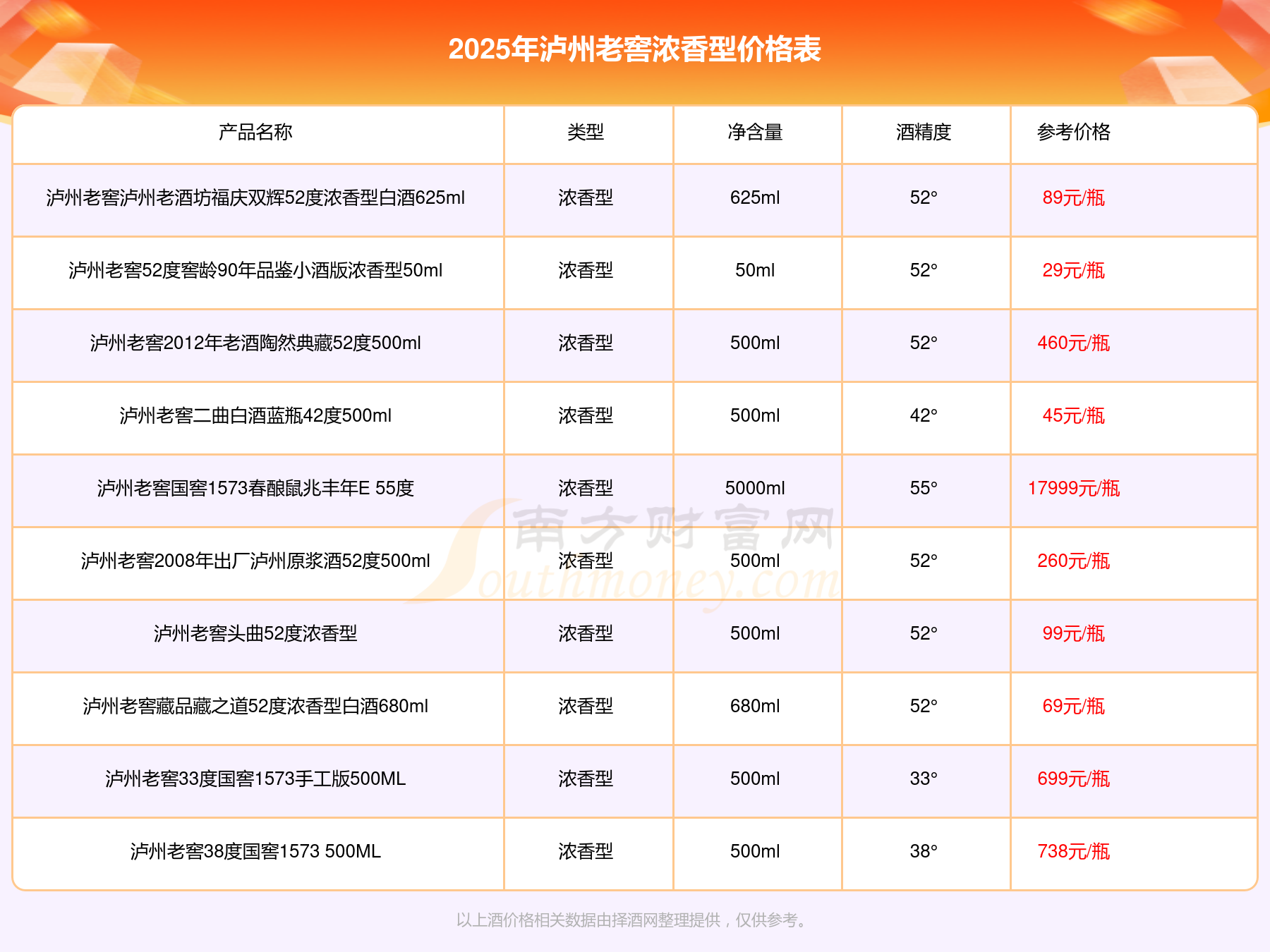 2025年,瀘州老窖國窖1573春釀鼠兆豐年E 55度、瀘州老窖國窖1573生命中的那壇酒55度014、瀘州老窖國窖1573春釀鼠兆豐年A 55度、瀘州老窖國窖1573生命中的那壇酒55度013濃香型白酒1000ml等瀘州老窖濃香型酒價格如下:瀘州老窖國窖1573春釀鼠兆豐年E 55度參考價17999元/瓶、瀘州老窖國窖1573生命中的那壇酒55度014參考價9999元/瓶、瀘州老窖國窖1573春釀鼠兆豐年A 55度參考價5088元/瓶、瀘州老窖國窖1573生命中的那壇酒55度013濃香型白酒1000ml參考價4988元/瓶。