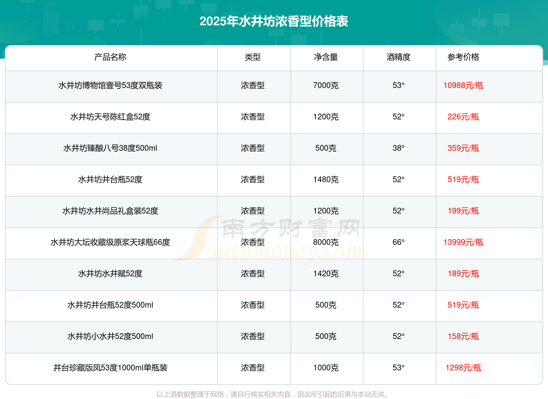 水井坊濃香型酒最新價格2025:水井坊大壇收藏級原漿天球瓶66度參考價13999元/瓶、水井坊博物館壹號53度雙瓶裝參考價10988元/瓶、53°水井坊公元十三600ml參考價2580元/瓶。