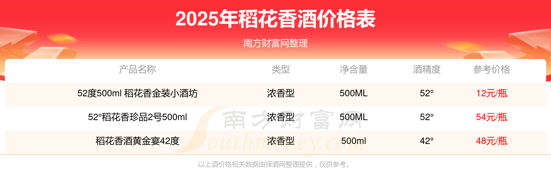 52°稻花香珍品2號500ml參考價54元/瓶、稻花香酒黃金宴42度參考價48元/瓶、52度500ml 稻花香金裝小酒坊參考價12元/瓶。
