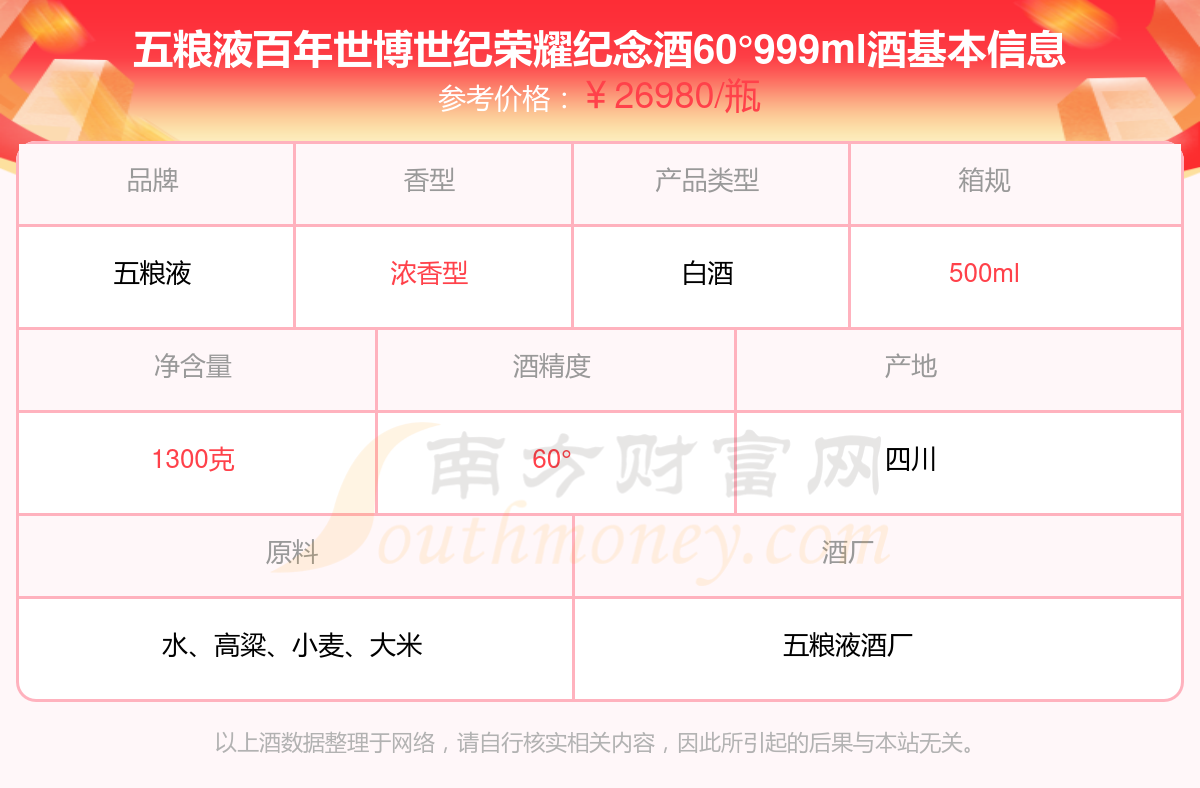 五糧液百年世博世紀(jì)榮耀紀(jì)念酒60°999ml基本信息