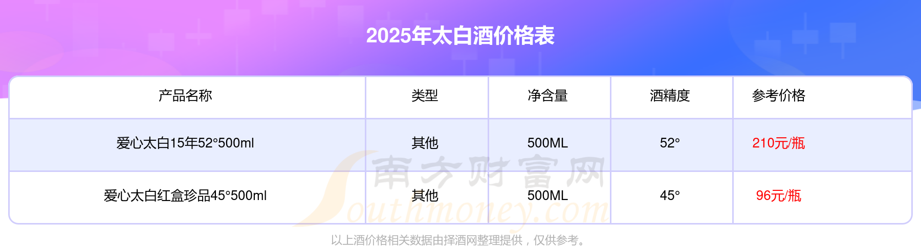 愛心太白15年52°500ml參考價(jià)210元/瓶、愛心太白紅盒珍品45°500ml參考價(jià)96元/瓶。