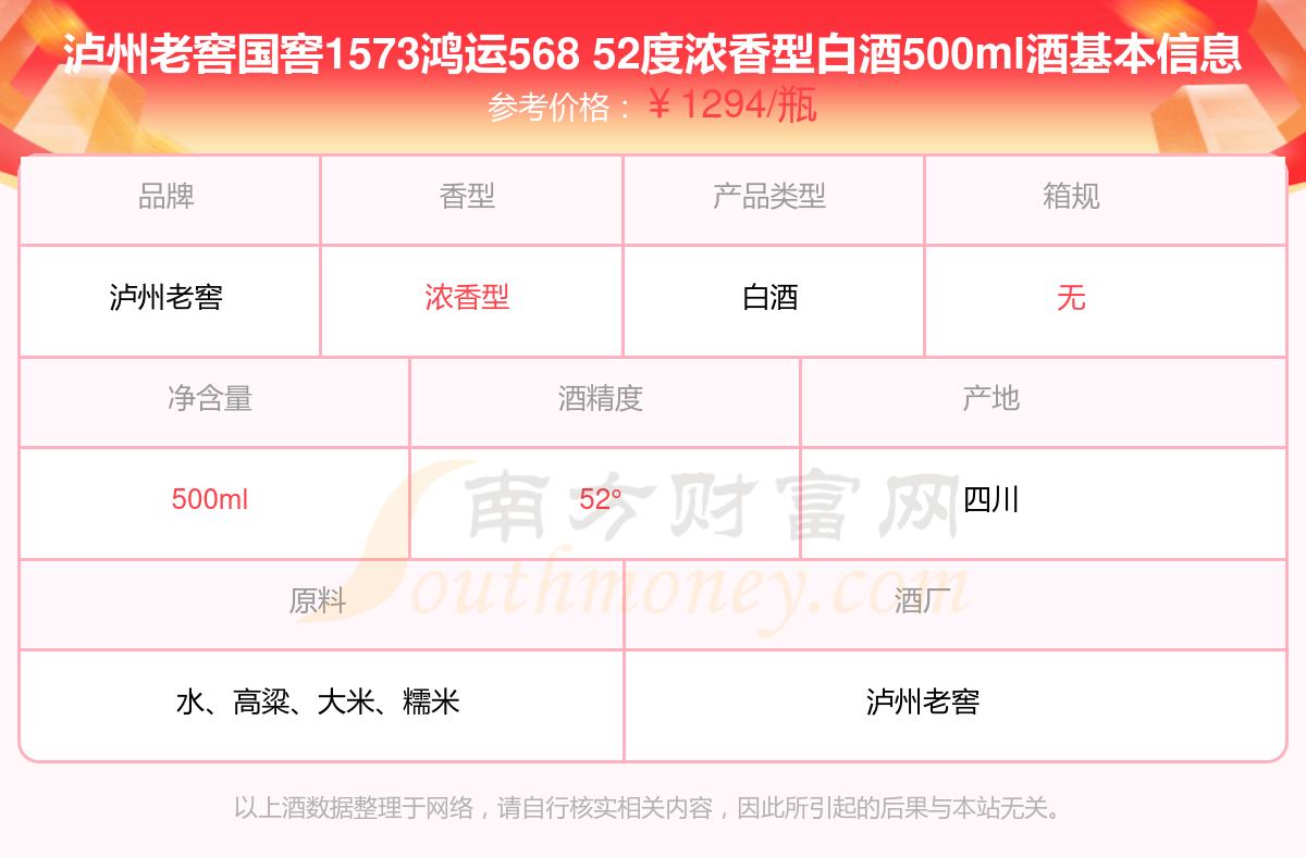 瀘州老窖國窖1573鴻運568 52度濃香型白酒500ml基本信息