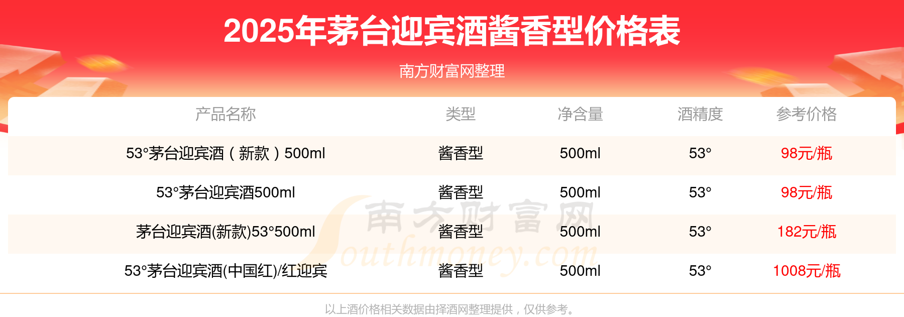 2025年茅臺(tái)迎賓酒醬香型酒53°茅臺(tái)迎賓酒(中國(guó)紅)/紅迎賓、茅臺(tái)迎賓酒(新款)53°500ml、53°茅臺(tái)迎賓酒(新款)500ml、53°茅臺(tái)迎賓酒500ml等最新價(jià)格如下:53°茅臺(tái)迎賓酒(中國(guó)紅)/紅迎賓參考價(jià)1008元/瓶、茅臺(tái)迎賓酒(新款)53°500ml參考價(jià)182元/瓶、53°茅臺(tái)迎賓酒(新款)500ml參考價(jià)98元/瓶、53°茅臺(tái)迎賓酒500ml參考價(jià)98元/瓶。