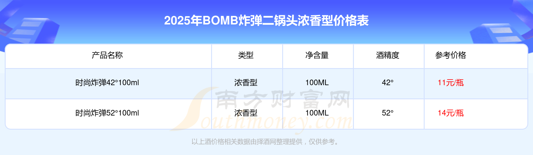 2025年BOMB炸彈二鍋頭濃香型酒時(shí)尚炸彈52°100ml、時(shí)尚炸彈42°100ml等最新價(jià)格如下: