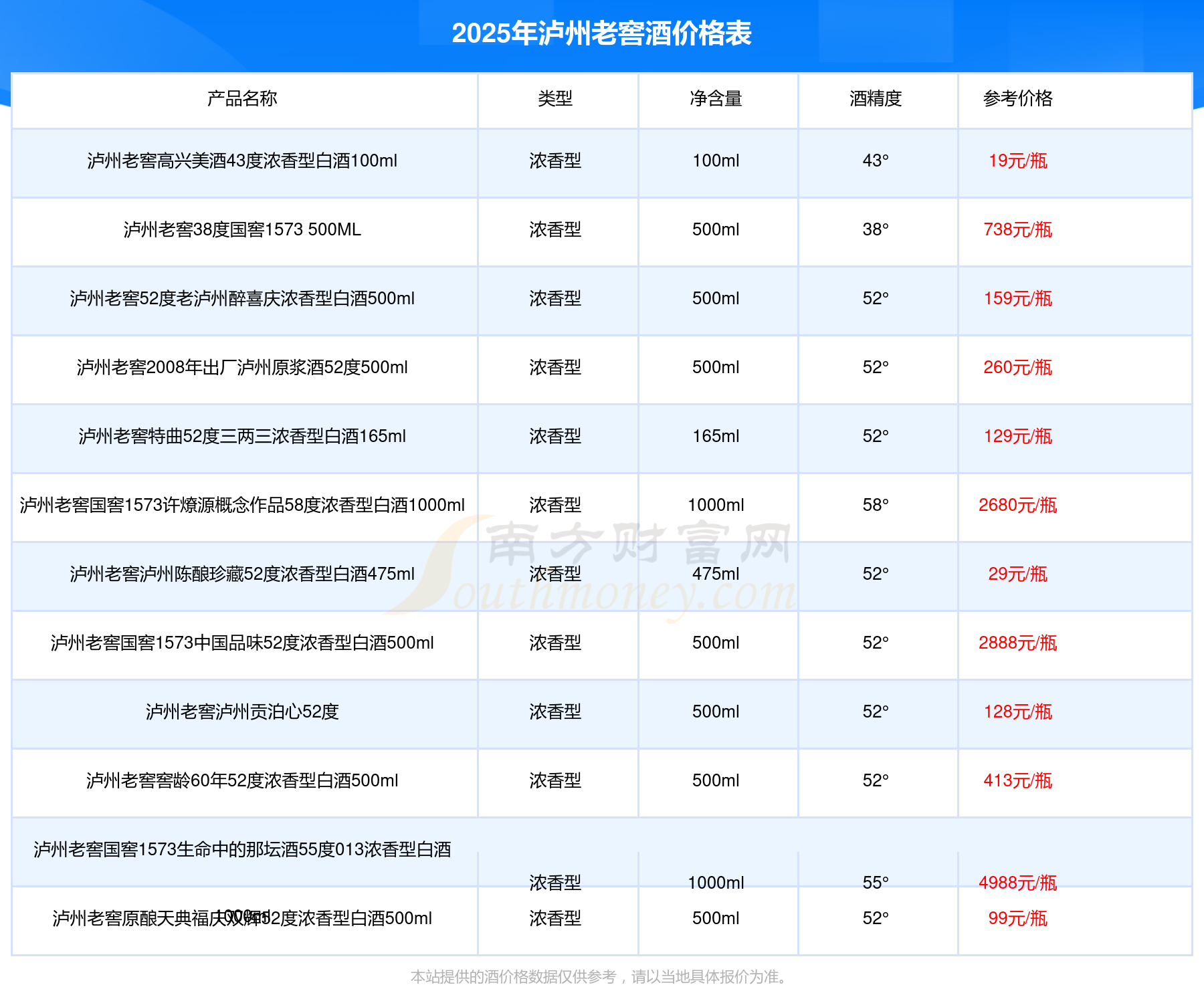 2025年瀘州老窖酒瀘州老窖國(guó)窖1573春釀鼠兆豐年E 55度、瀘州老窖國(guó)窖1573生命中的那壇酒55度014、瀘州老窖國(guó)窖1573春釀鼠兆豐年A 55度、瀘州老窖國(guó)窖1573生命中的那壇酒55度013濃香型白酒1000ml、瀘州老窖國(guó)窖1573生命中的那壇酒55度009 1000ml、瀘州老窖國(guó)窖1573中國(guó)品味52度濃香型白酒500ml、瀘州老窖國(guó)窖1573許燎源概念作品58度濃香型白酒1000ml等最新價(jià)格如下:瀘州老窖國(guó)窖1573春釀鼠兆豐年E 55度參考價(jià)17999元/瓶、瀘州老窖國(guó)窖1573生命中的那壇酒55度014參考價(jià)9999元/瓶、瀘州老窖國(guó)窖1573春釀鼠兆豐年A 55度參考價(jià)5088元/瓶、瀘州老窖國(guó)窖1573生命中的那壇酒55度013濃香型白酒1000ml參考價(jià)4988元/瓶、瀘州老窖國(guó)窖1573生命中的那壇酒55度009 1000ml參考價(jià)4288元/瓶、瀘州老窖國(guó)窖1573中國(guó)品味52度濃香型白酒500ml參考價(jià)2888元/瓶、瀘州老窖國(guó)窖1573許燎源概念作品58度濃香型白酒1000ml參考價(jià)2680元/瓶。
