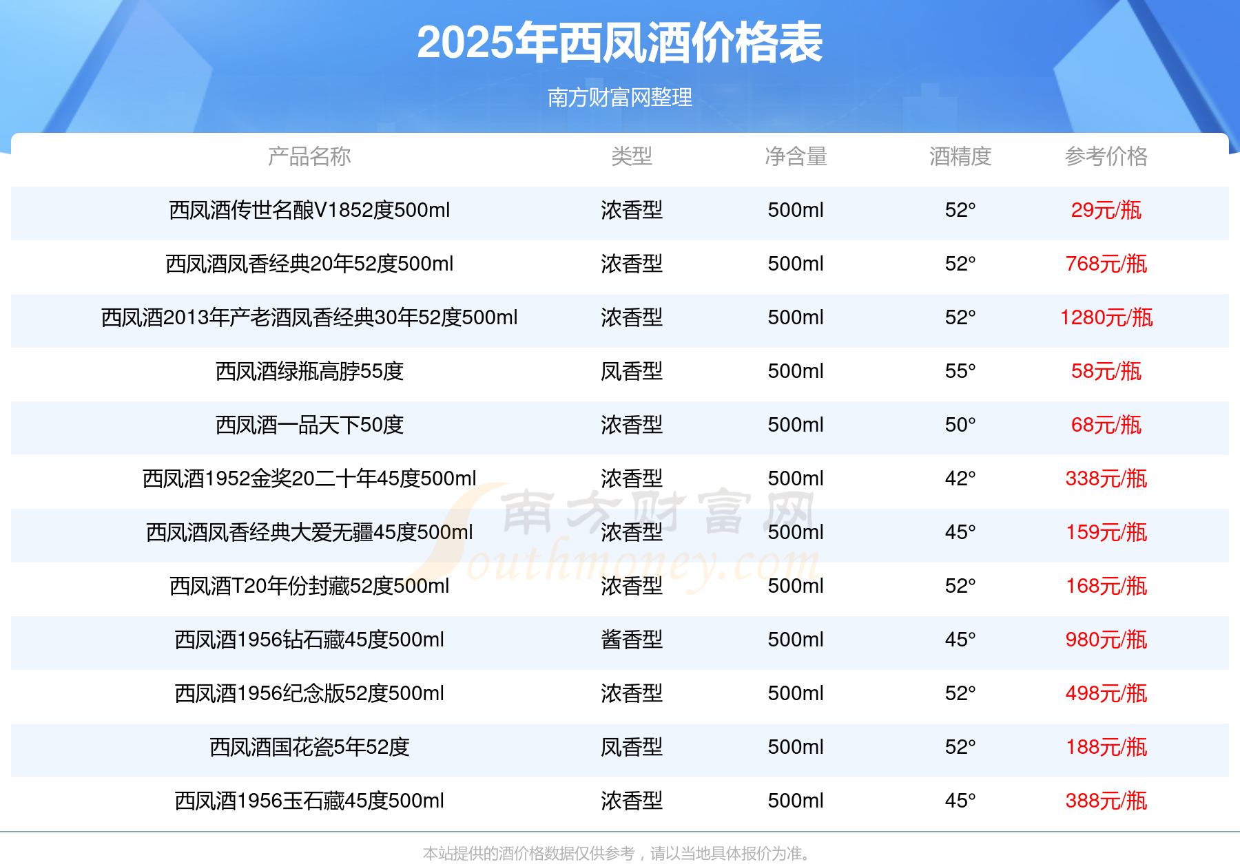 2025年,西鳳酒 酒海私藏55度3000ml、西鳳酒1952金獎50 55度500ml、西鳳酒2013年產(chǎn)老酒鳳香經(jīng)典30年52度500ml等西鳳酒價格如下: