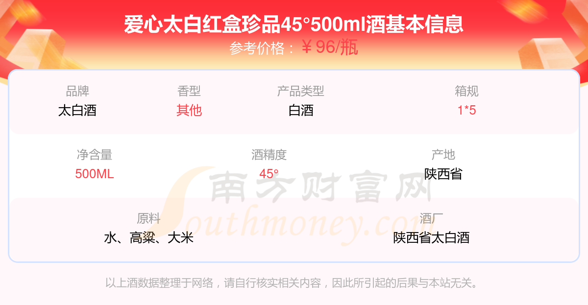 愛心太白紅盒珍品45°500ml基本信息