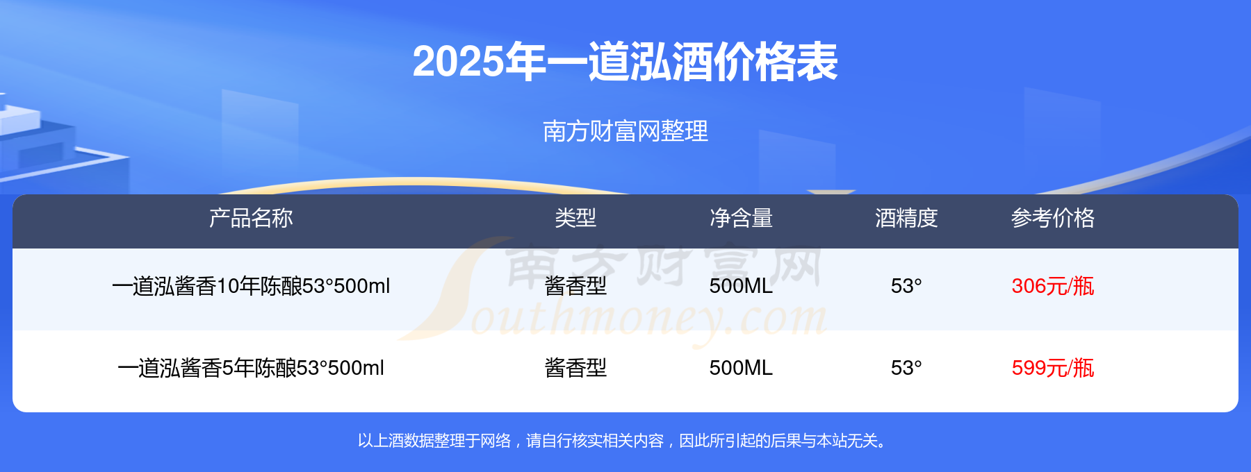 2025年,一道泓醬香5年陳釀53°500ml、一道泓醬香10年陳釀53°500ml等一道泓酒價格如下:一道泓醬香5年陳釀53°500ml參考價599元/瓶、一道泓醬香10年陳釀53°500ml參考價306元/瓶。
