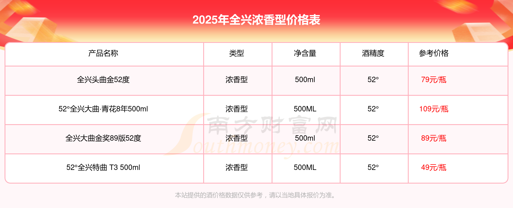 2025年全興濃香型酒52°全興大曲·青花8年500ml、全興大曲金獎89版52度、全興頭曲金52度、52°全興特曲 T3 500ml等最新價格如下: