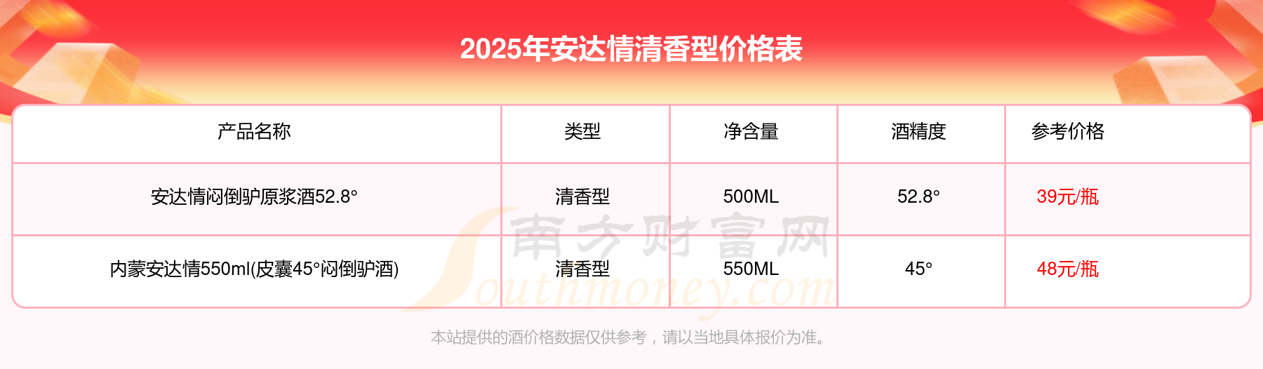 2025年安達(dá)情清香型價(jià)格最高的酒是內(nèi)蒙安達(dá)情550ml(皮囊45°悶倒驢酒),參考價(jià)48元/瓶,最低的是安達(dá)情悶倒驢原漿酒52.8°,參考價(jià)39元/瓶,價(jià)格高低差為9元/瓶。